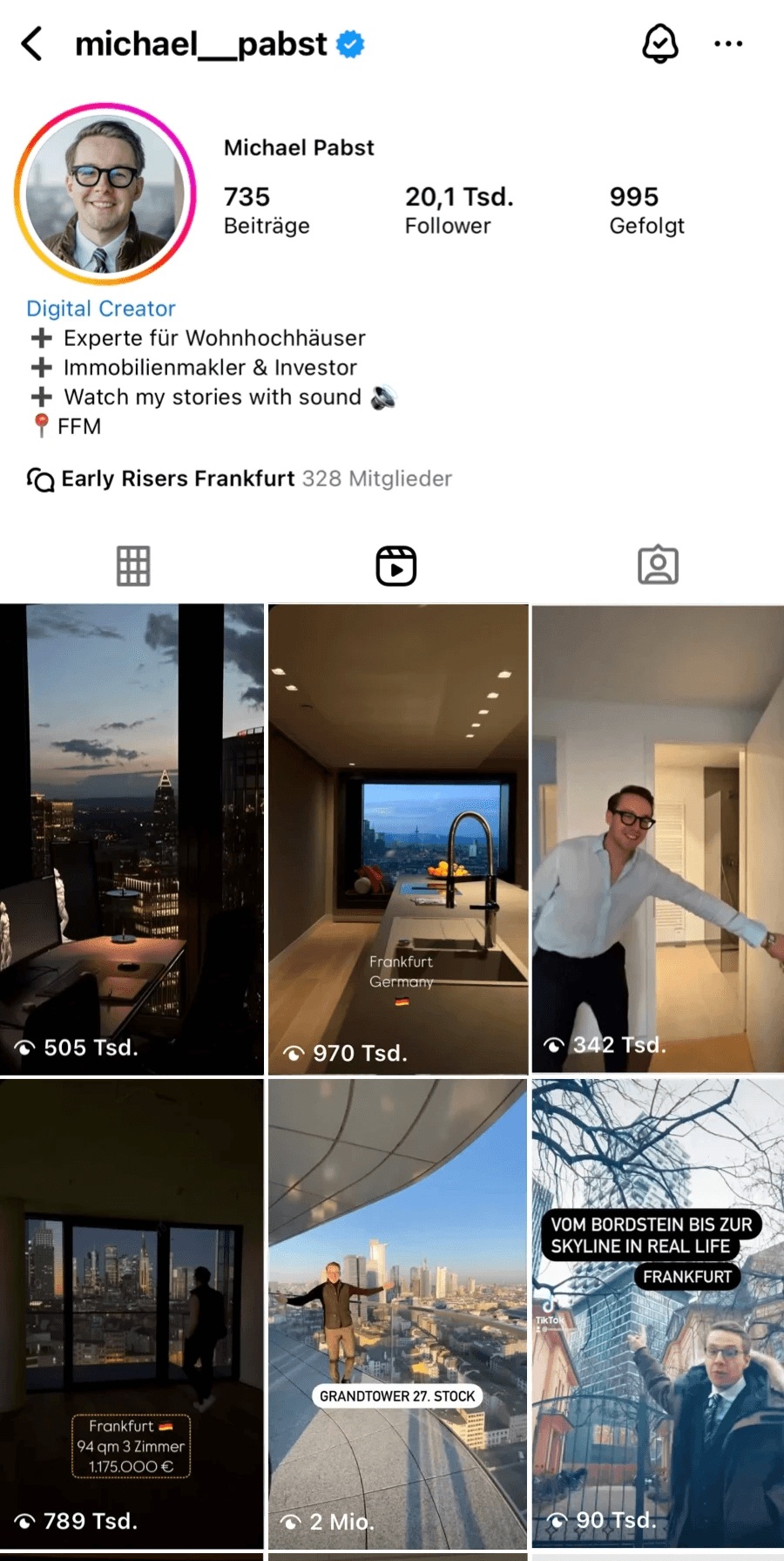 Unsere Immobilien-Videos erreichen regelmäßig Millionen von Aufrufen. Man kennt uns in der Branche – gerade im Kontext der Luxusimmobilien in Frankfurt – und wir verbessern durch Aufklärung aktiv das Image von Wohntürmen in Frankfurt und steigern deren Begehrlichkeit. Davon profitieren Sie – ob Sie eine Eigentumswohnung im Hochhaus verkaufen oder kaufen möchten